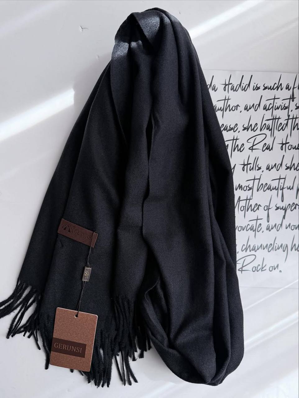 رنگ مشکی عميق و باکیفیت این شال جلوه ای خاص به چهره میدهد و به راحتی با انواع مانتو و اکسسوری ست میشود. لوگوی ظریف برند گرنسی روی پارچه حس خاص بودن و اصالت را به استایل شما می افزاید