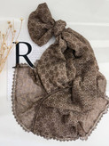 لطافت پارچه حریر باعث می شود شال به زیبایی روی سر بنشیند و ریزش طبیعی آن فرم صورت را ظریف تر نشان دهد. گیپور کارشده در دور تا دور شال نیز جلوه ای خاص و مجلسی ایجاد کرده که آن را برای مهمانی ها مراسم رسمی و استایلهای شیک روزمره ایده آل میکند.
