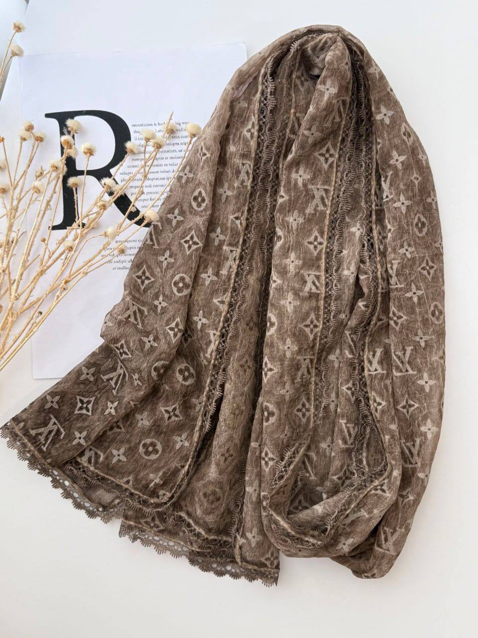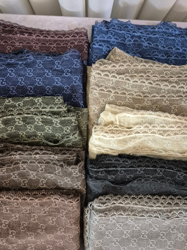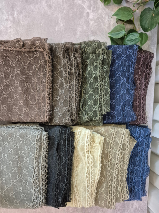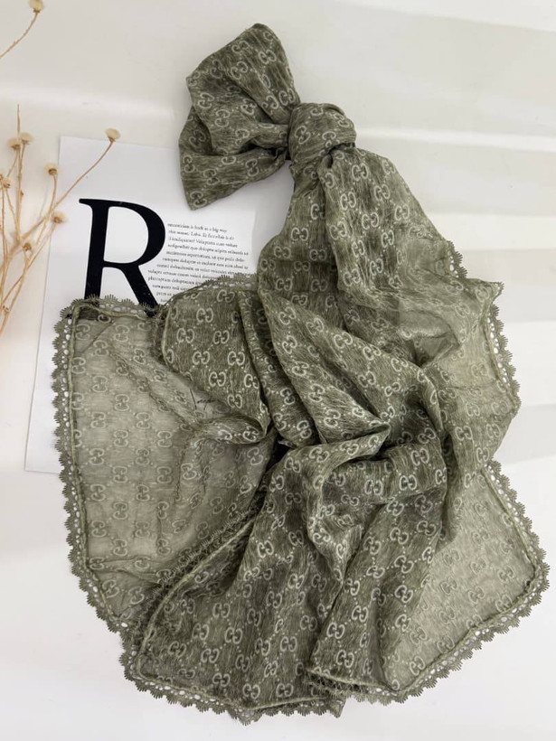 لطافت پارچه حریر باعث می شود شال به زیبایی روی سر بنشیند و ریزش طبیعی آن فرم صورت را ظریف تر نشان دهد. گیپور کارشده در دور تا دور شال نیز جلوه ای خاص و مجلسی ایجاد کرده که آن را برای مهمانی ها مراسم رسمی و استایلهای شیک روزمره ایده آل میکند.